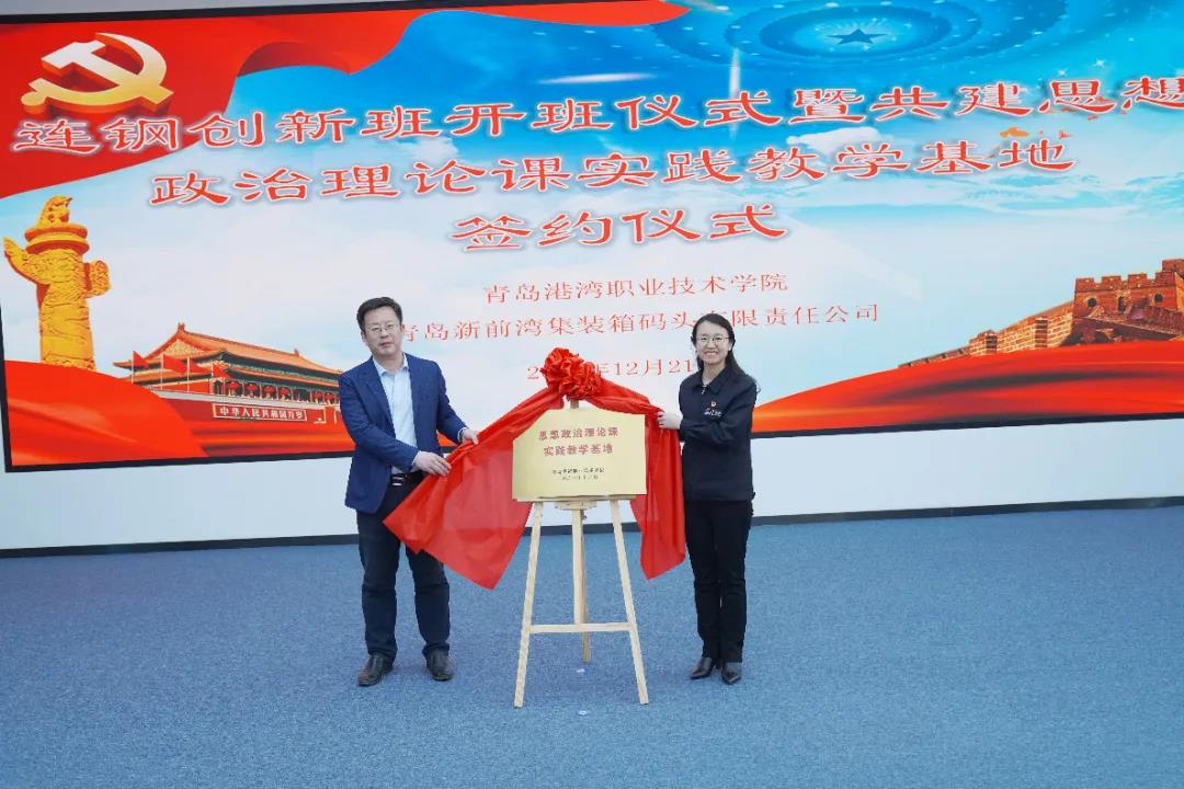 12月21日,青岛港湾职业技术学院与青岛新前湾集装箱码头有限责任公司在自动化码头交流中心隆重举行“连钢创新班”开班仪式暨共建思想政治理论课实践教学基地活动。