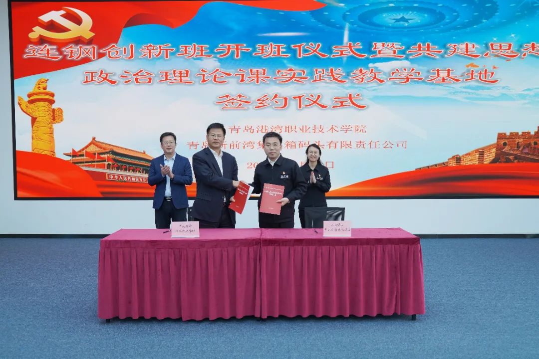 山东港口青岛新前湾集装箱码头有限责任公司总经理、“连钢创新团队”核心成员李永翠,山东港口青岛新前湾集装箱码头有限责任公司党委副书记、纪委书记、工会主席田昌明,青岛港湾职业技术公司党委副书记、纪委书记王海蛟、副经理陈纪伟出席活动,活动中双方共同启动“连钢创新班”,并进行共建思想政治理论课实践教学基地签约,双方干部职工代表、思政课教师代表和首批“连钢创新班”学员参加了此次活动。