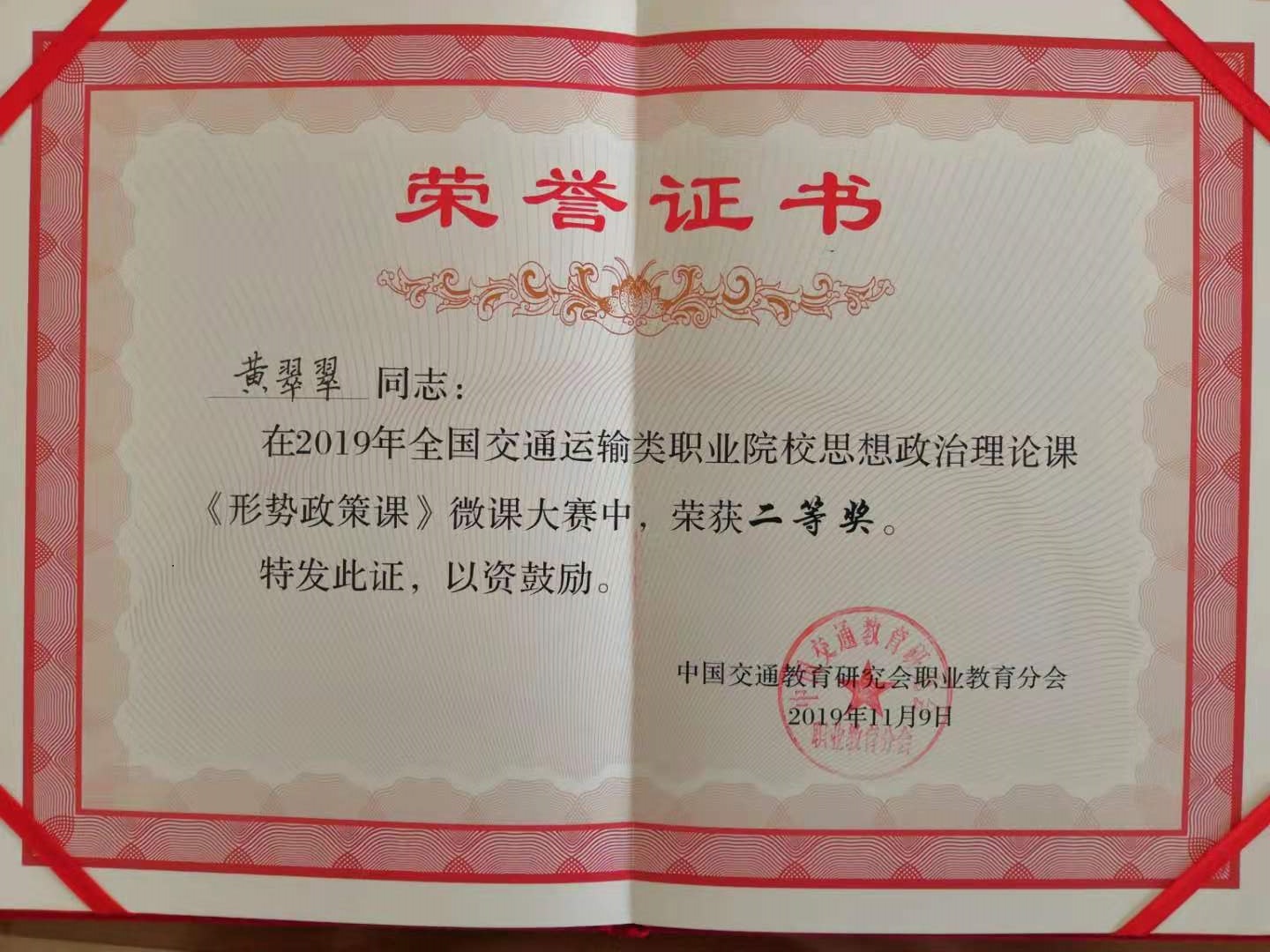 近日,由中国交通教育研究会职教分会思想政治工作委员会主办、陕西交通职业技术学院承办的“2019年全国交通运输类职业院校思想政治理论课《形势与政策》微课大赛”的现场展示决赛在陕西西安举行,公司思政部教师黄翠翠代表学院参赛。